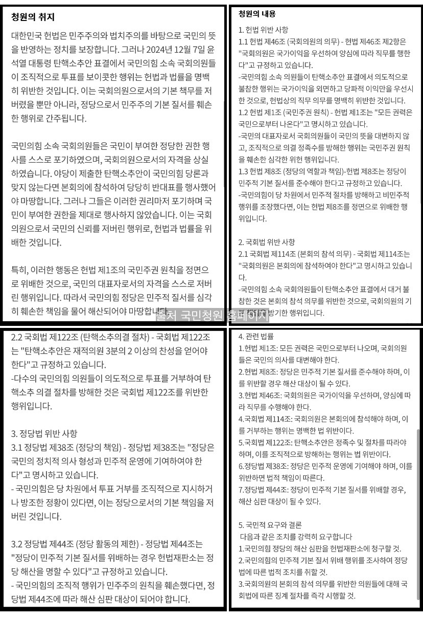 - 국민 청원명: 헌법과 법률을 유린한 국민의힘 정당 해산에 관한 청원